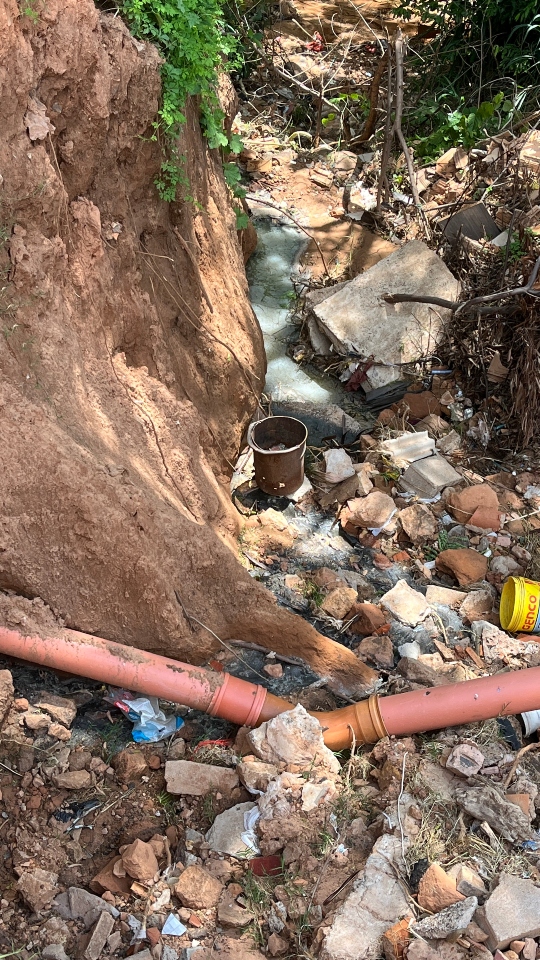 Na manhã desta segunda-feira (11) a reportagem foi ao local, e constatou outro fato grave: há vazamento de esgoto sanitário no meio ambiente. Há uma tubulação de PVC exposta e com sinais de comprometimento, com vazamento de esgoto. Há água escura e com forte odor. Há cones de sinalização no local.
