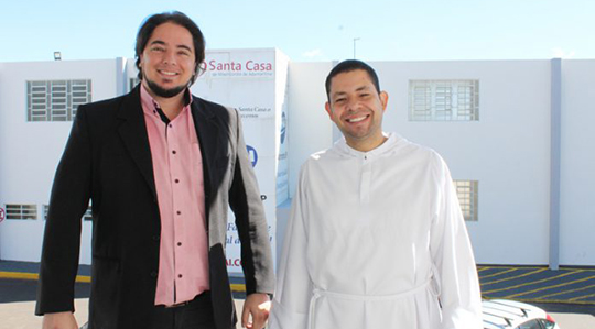 Gestor comercial da LRG Construtora, Wesley Meira, com Frei Mateus, administrador da Santa Casa (Foto: João Vinícius | Grupo Impacto).