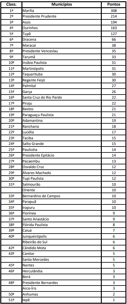 Com destaque para a capoeira e o biribol, Adamantina encerrou sua participação nos Jogos Regionais em vigésimo lugar, com 19 pontos. Marília venceu a competição com 308 pontos. Tupã – a cidade anfitriã – ficou em quinto lugar com 127 pontos. Na lanterna, Iepê, com um ponto, na posição número 51 do quadro final.