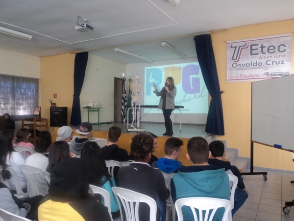 A Etec Amim Jundi, de Osvaldo Cruz, realizou nos dias 19 e 22 de agosto, com os alunos do Ensino Médio, Técnico em Administração Integrado ao Ensino Médio (ETIM) e dos Cursos Técnico em Enfermagem, Técnico em Farmácia e Técnico em Segurança do Trabalho, palestra sobre RPG – Reeducação Postural Global, com a fisioterapeuta e especialista em Ortopedia e Traumatologia nas Patologias e Cirurgias dos Joelhos e em Psicopedagogia Sônia Lima Rossi.