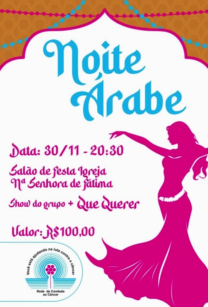 A Noite Árabe vai ser realizada no salão de eventos da Paróquia Nossa Senhora de Fátima, com início às 20h30. Serão servidos entradas e pratos quentes e frios da culinária árabe. A recepção inicial contará com apresentação de dança do ventre, e no evento show com o grupo musical + Que Querer, com amplo repertório.