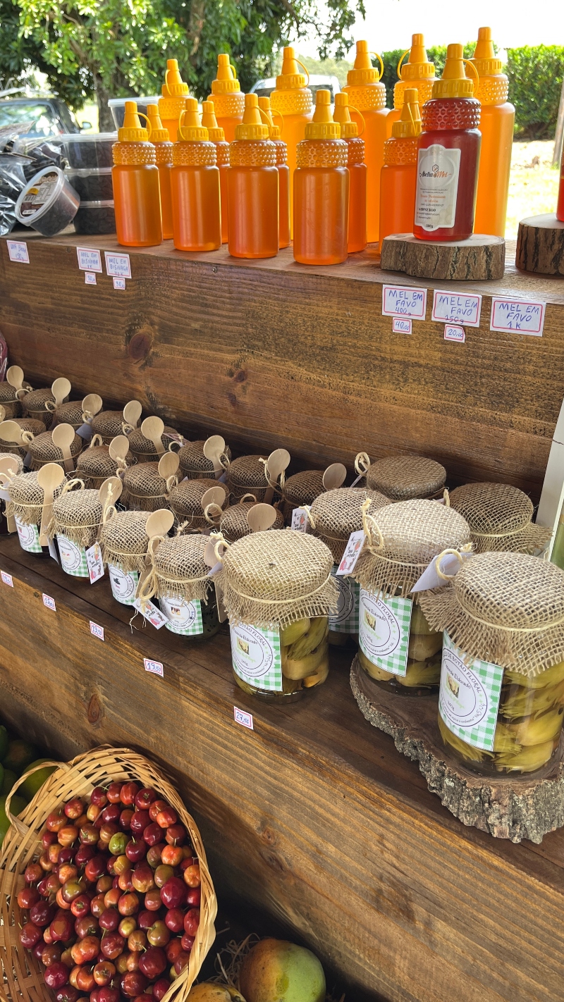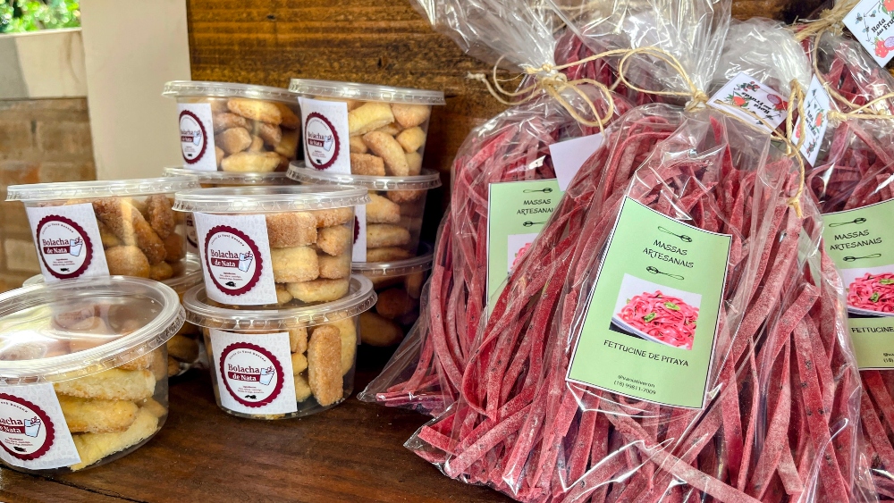 No evento também foi montada uma banca com venda de produtos locais, entre eles uma massa fettuccine de pitaya, o picles do botão da pitaya, biscoitos de nata, mel, geleias, queijos e frutas.