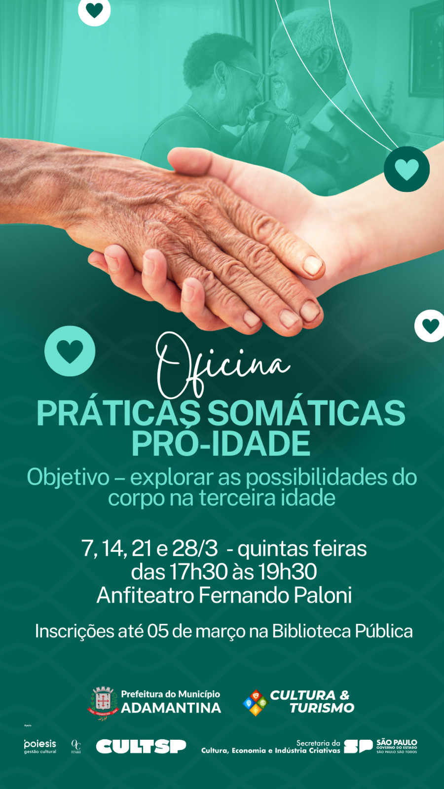 Adamantina recebe neste mês de março a oficina "Práticas Somáticas Pró-Idade”, com o desafio de explorar as possibilidades do corpo na terceira idade e ampliar as interações de bem-estar nesse grupo etário. A programação gratuita, com 20 vagas, é trazida à cidade pela Secretaria Municipal de Cultura e Turismo.