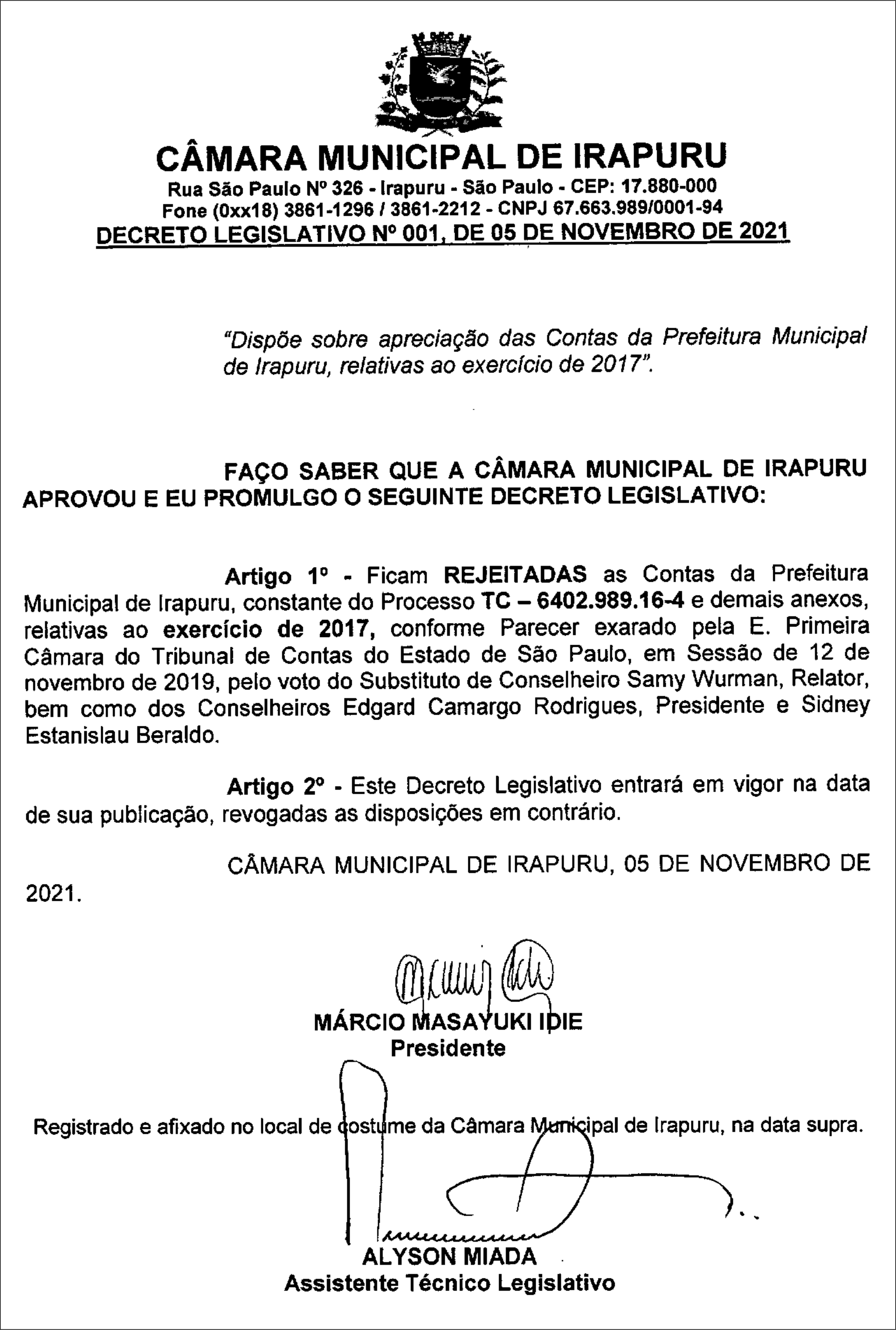 Com base no parecer foi elaborado um projeto de decreto legislativo com a rejeição das contas, votado em plenário, sendo aprovado pela maioria dos vereadores. Com isso, as contas municipais de 2017, do ex-prefeito Silvio Ushijima, foram rejeitadas pela Câmara, levando à expedição do Decreto Legislativo Nº 001/2021, de 5 de novembro. Veja:
