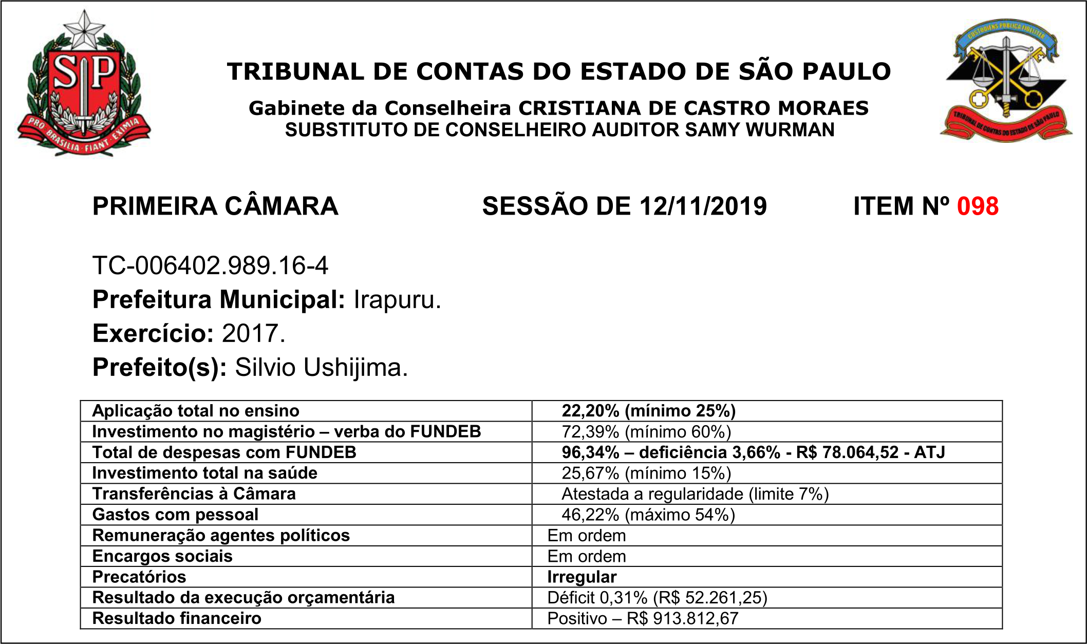 Por maioria dos votos, a Câmara Municipal de Irapuru rejeitou as contas municipais de 2017, da gestão do ex-prefeito Silvio Ushijima. Os vereadores acolheram o parecer desfavorável do Tribunal de Contas do Estado de São Paulo (TCESP), conforme Processo TC-006402.989.16-4.