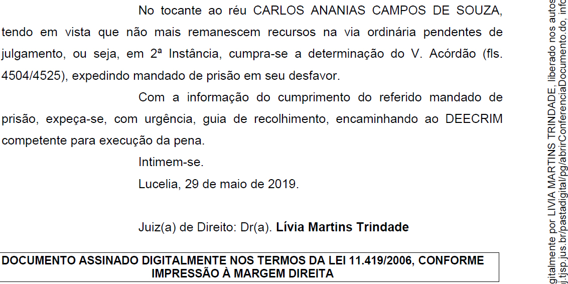 Em sua decisão liberado nos autos em 29 de maio último, às 17h20, conforme Processo 0002022-53.2005.8.26.0326, ela escreve: “No tocante ao réu Carlos Ananias Campos de Souza, tendo em vista que não mais remanescem recursos na via ordinária pendentes de julgamento, ou seja, em 2ª Instância, cumpra-se a determinação do V. Acórdão (fls. 4504/4525), expedindo mandado de prisão em seu desfavor. Com a informação do cumprimento do referido mandado de prisão, expeça-se, com urgência, guia de recolhimento, encaminhando ao DEECRIM competente para execução da pena.