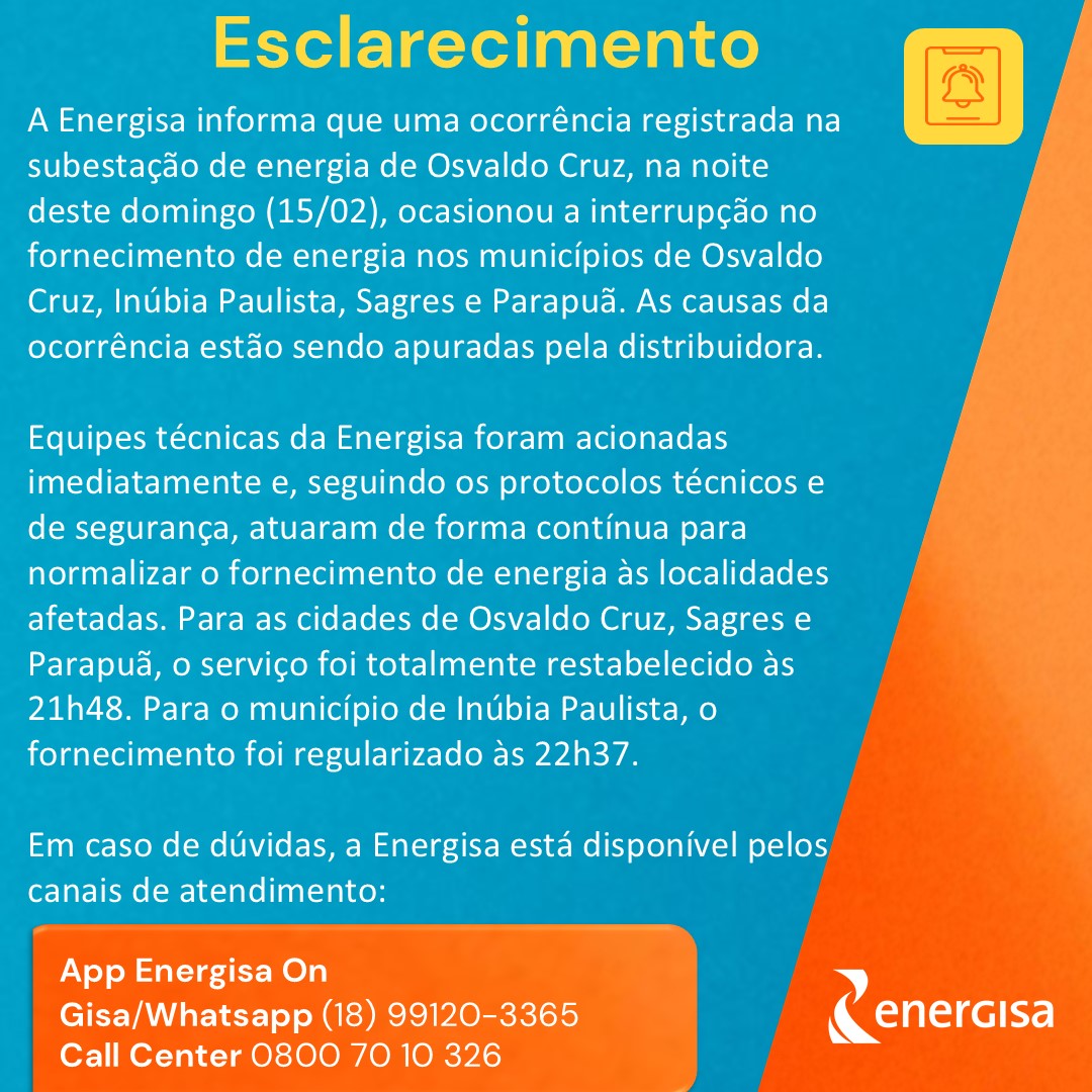 O fornecimento de energia foi totalmente restabelecido às 21h48 nos municípios de Osvaldo Cruz, Sagres e Parapuã. Já em Inúbia Paulista, a energia foi restabelecida às 22h37.