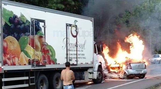 Carro com as duas moradoras de Rinópolis ficou consumido pelo fogo (Reprodução/Site Mais Tupã).