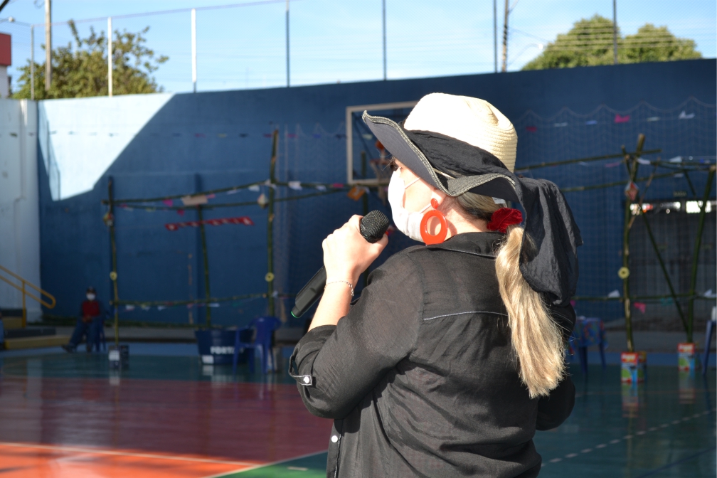 Profa. Patrícia deu boas-vindas aos convidados com a abertura oficial da festa (Foto: Priscila Caldeira).