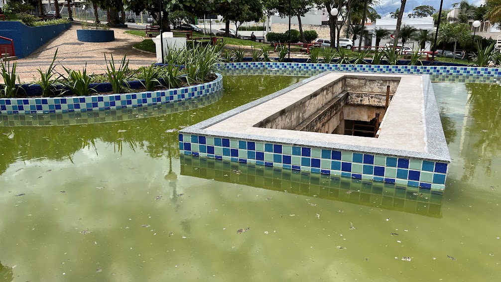 Fonte em praça tem água parada; após pedido de informações do Siga Mais, Prefeitura manda limpar