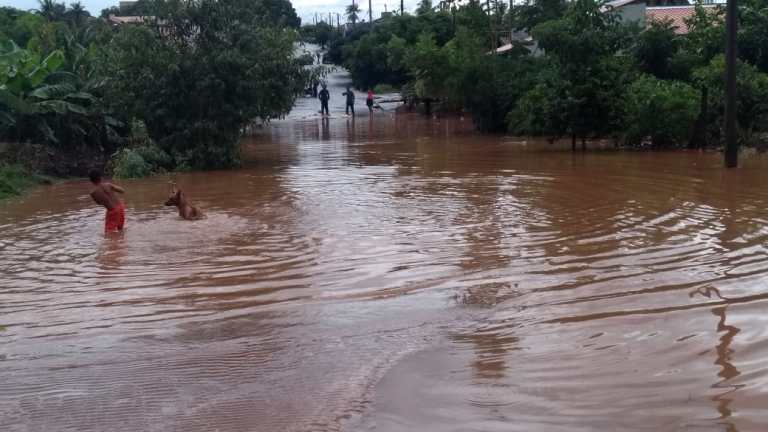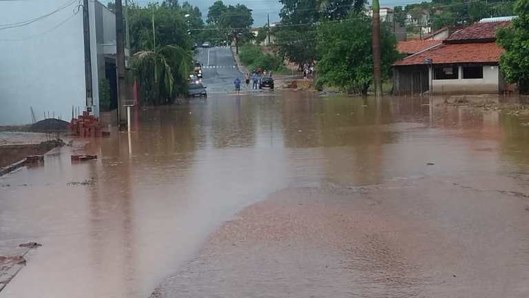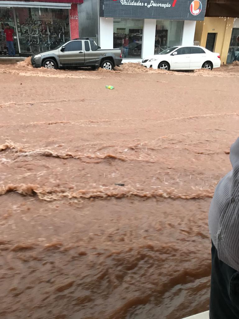 No principal núcleo de comércio da cidade – Avenida Vereador José Gomes Duda – uma forte enxurrada invadiu estabelecimentos comerciais, residências e outros imóveis.