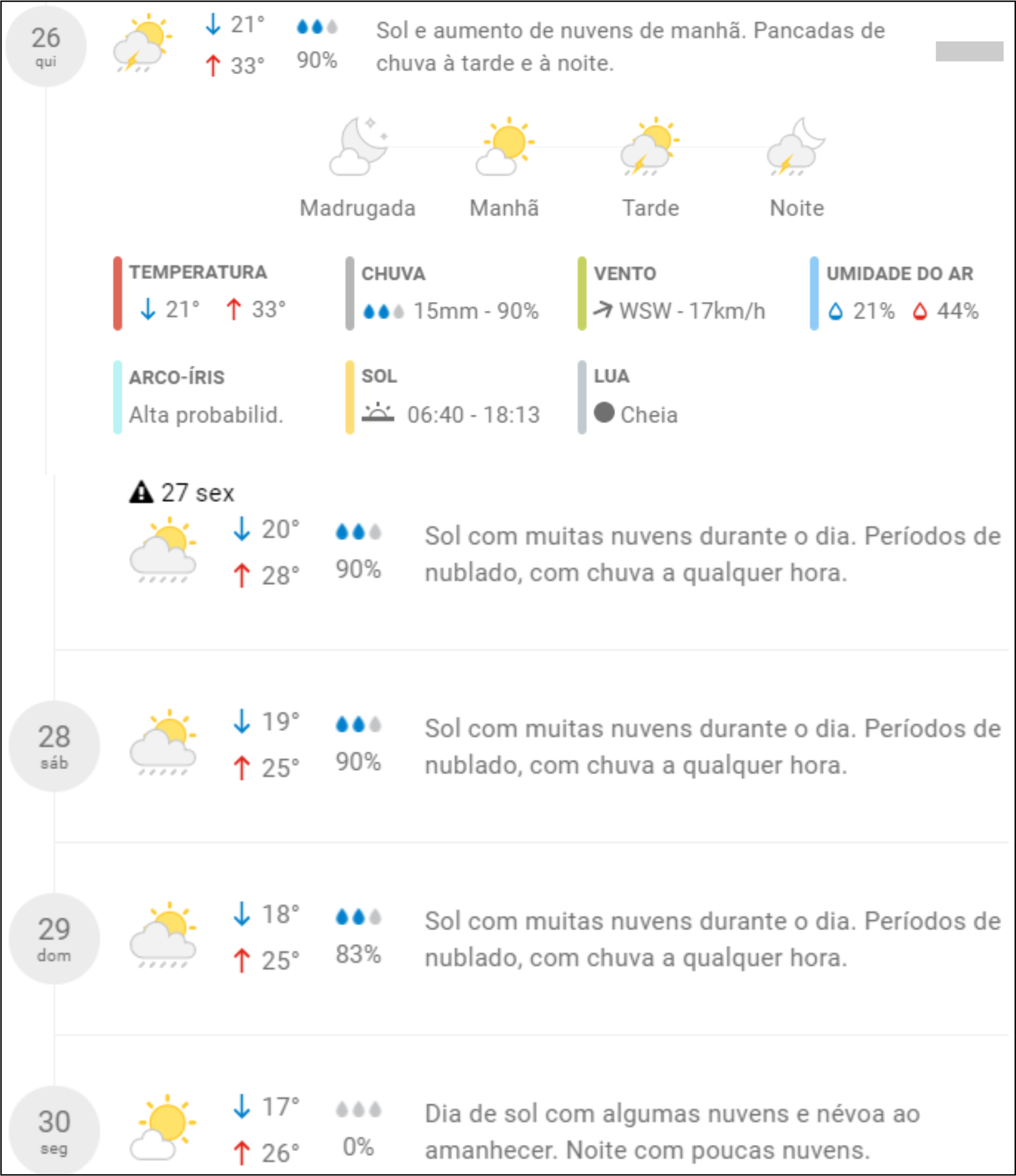 Já a Grande São Paulo pode ter pancadas de chuva à noite. As demais áreas da Região Sudeste têm bastante sol e calor. Pode chover rapidamente no extremo norte do Espírito Santo.