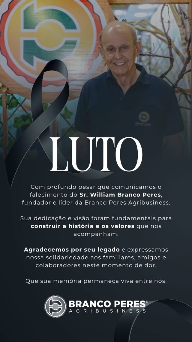 “Com profundo pesar que comunicamos o falecimento do Sr. William Branco Peres, fundador e líder da Branco Peres Agribusiness.