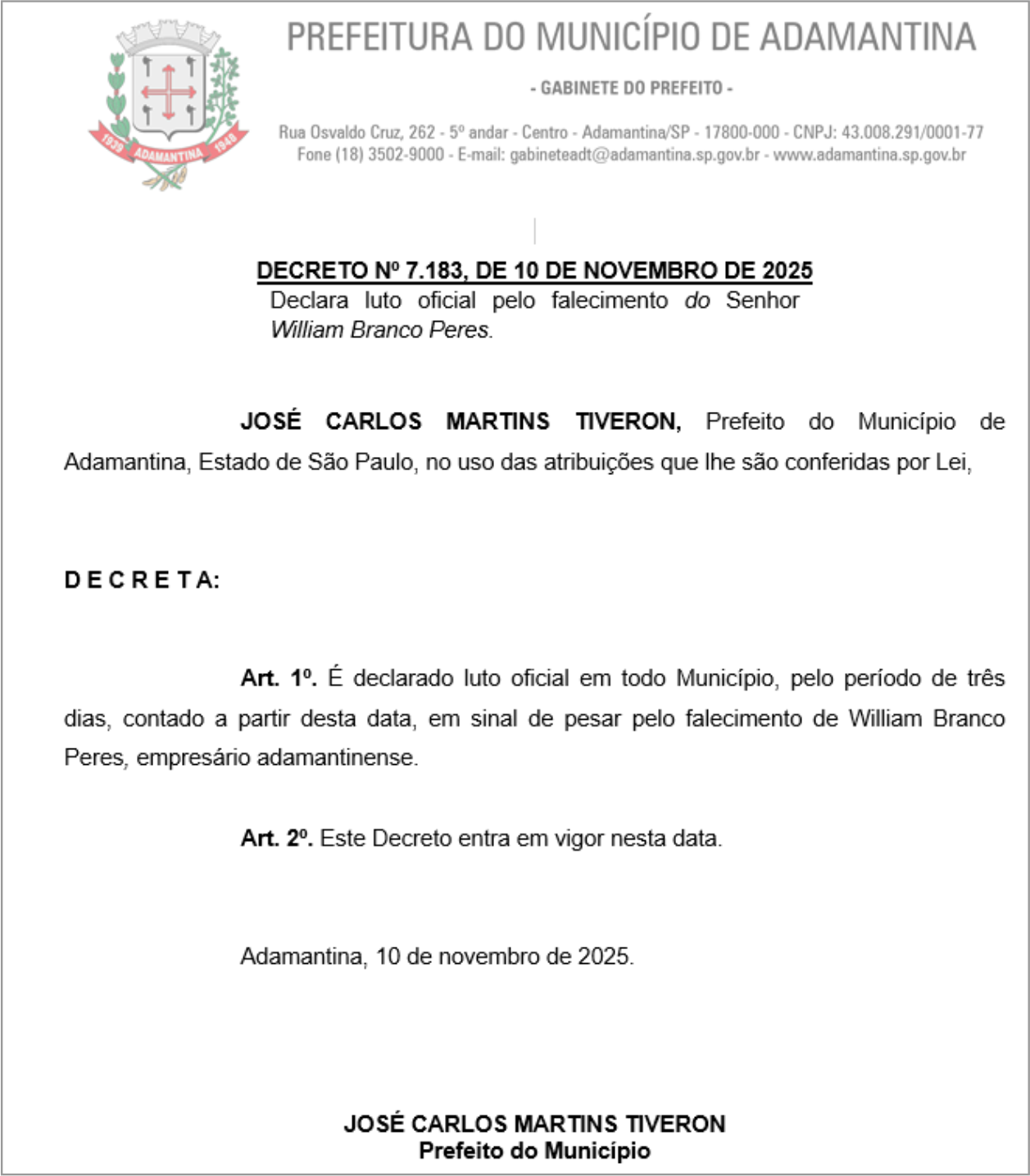 O prefeito de Adamantina, José Tiveron, decretou nesta segunda-feira luto oficial por três dias em todo o município, conforme estabelece o Decreto Nº 7.183, de 10 de novembro de 2025, que entrou em vigor na mesma data.
