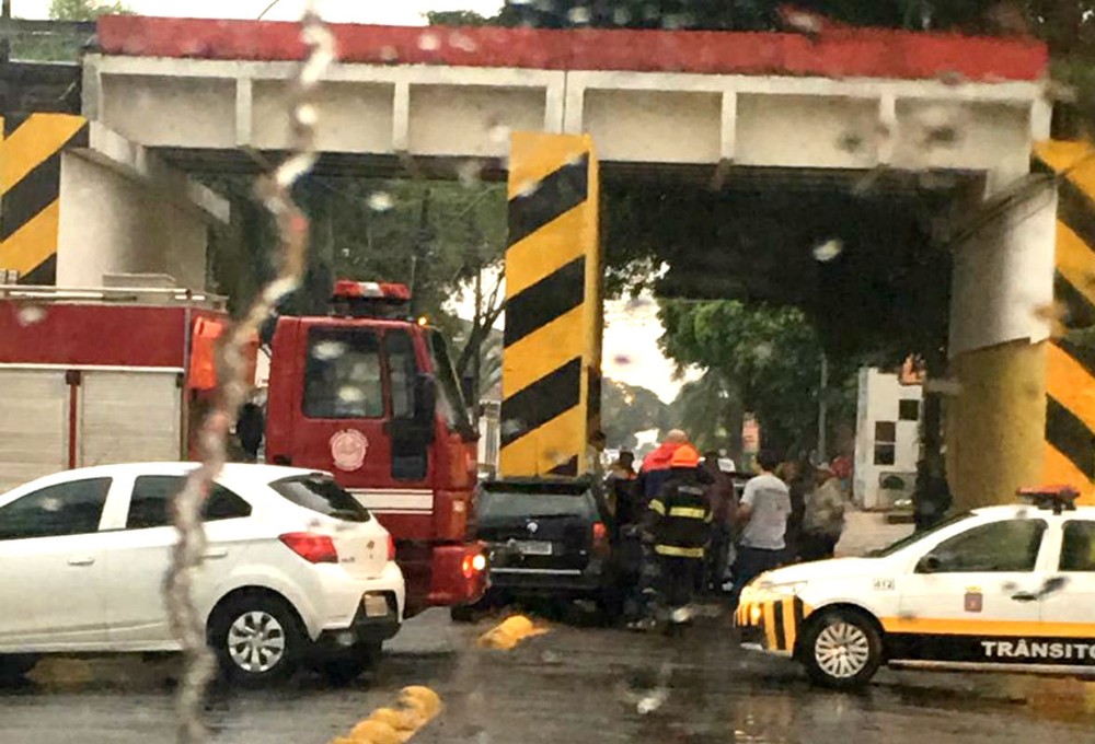 O carro ficou com a frente destruída, após o choque contra a coluna de concreto, que fica no centro da via e divide as duas mãos de direção. Chovia no momento do acidente.