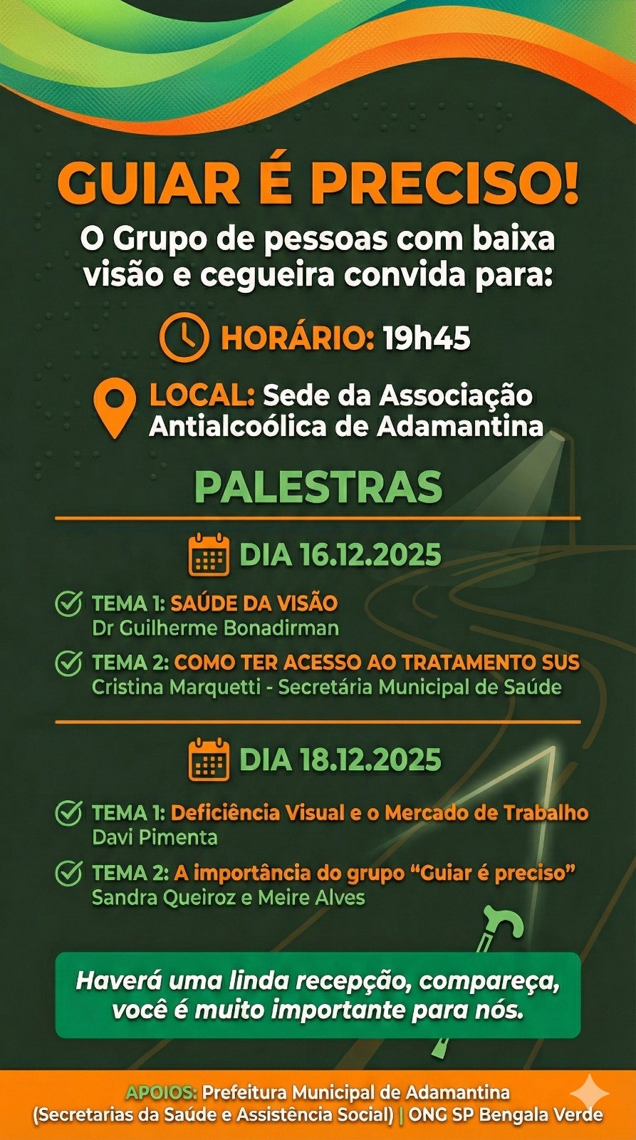 O grupo “Guiar é Preciso”, formado por pessoas com baixa visão e cegueira, promove em Adamantina um ciclo de palestras voltado à conscientização, orientação e fortalecimento da rede de apoio às pessoas com deficiência visual. As atividades acontecem nos dias 16 e 18 de dezembro, a partir das 19h45, na sede da Associação Antialcoólica de Adamantina.