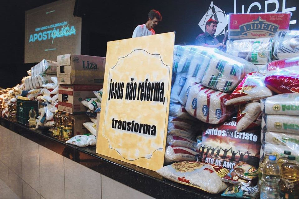 Os alimentos foram reunidos na noite desta terça-feira (3) no altar da Igreja, em uma celebração religiosa presidida pelo pastor Toninho Donha, de bênção pelos resultados e a destinação. A iniciativa é fruto da arrecadação realizada pelos fieis, que se organizam em células. (Continua após a publicidade...)