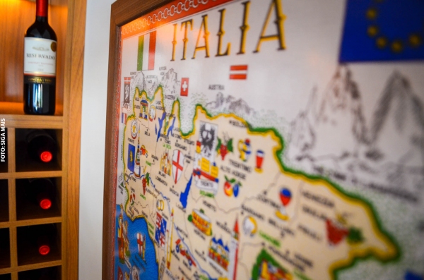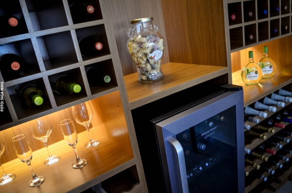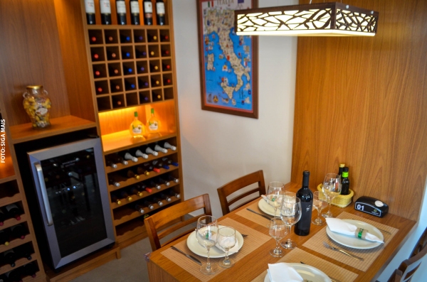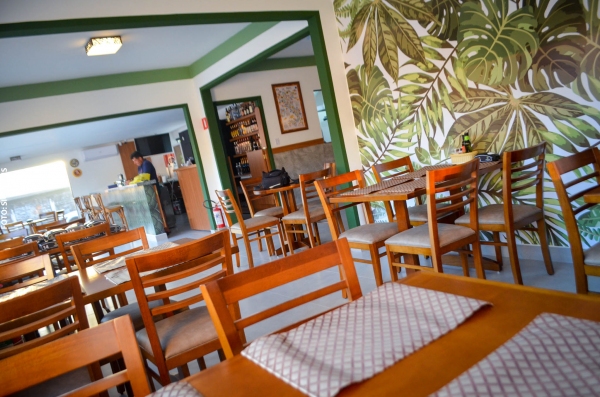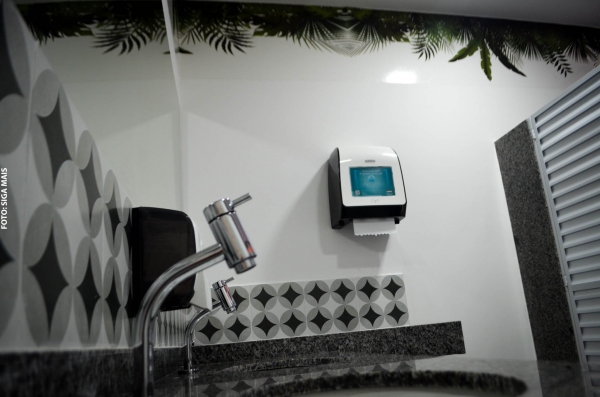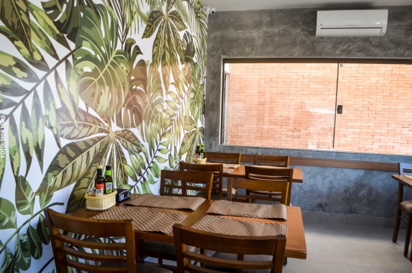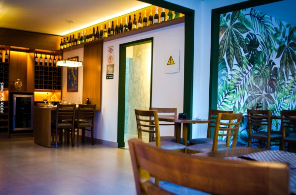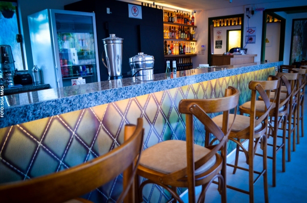 Na área interna, o serviço se dá em mesas e balcão. Há ainda um espaço exclusivo junto à adega. Os banheiros foram cuidadosamente dimensionados, reservados aos públicos feminino e masculino, além de banheiro acessível (ambos os sexos).
