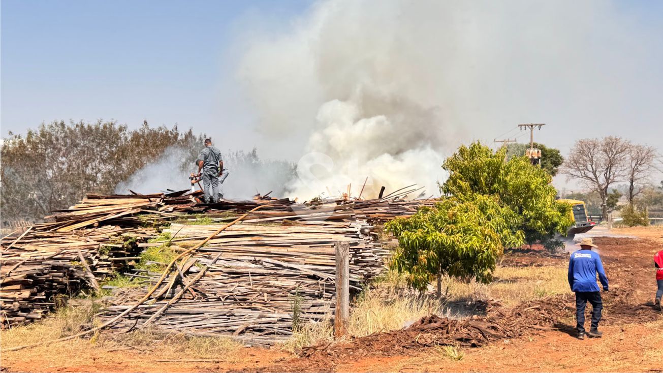 Incêndio atinge madeira depositada em terreno ao lado de madeireira em Adamantina