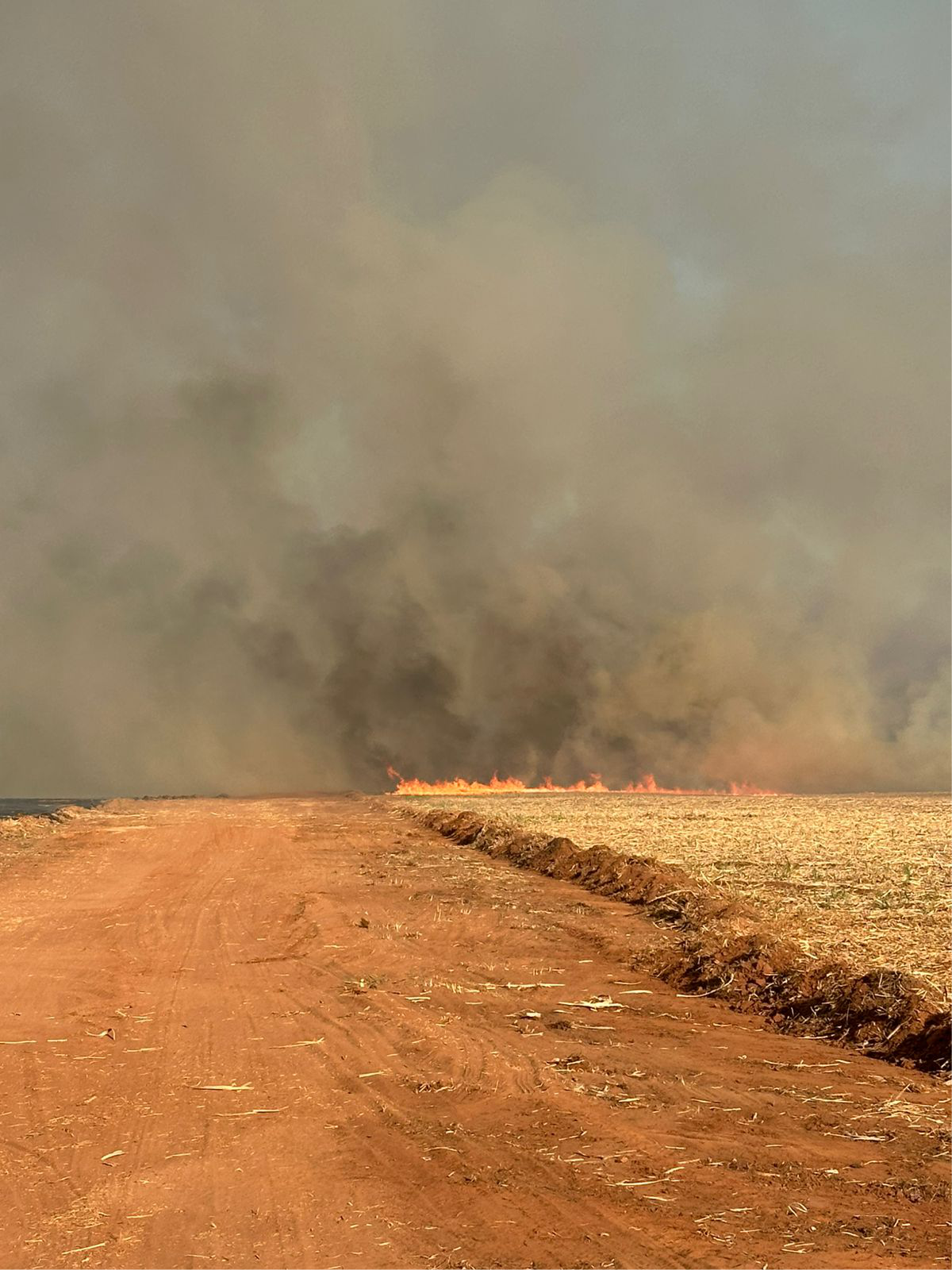 As chamas estão fora de controle e avançam pelas áreas de cultivo. A tentativa das equipes e conter o avanço com uso de água e aceiros.