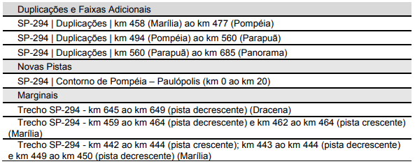 Em especial, na SP 294, estão previstas obras de duplicação da SP-294 entre Marília e Panorama, vias marginais em Dracena e Marilia e o novo desvio em Pompéia, que irá tirar o trânsito rodoviário da a cidade.