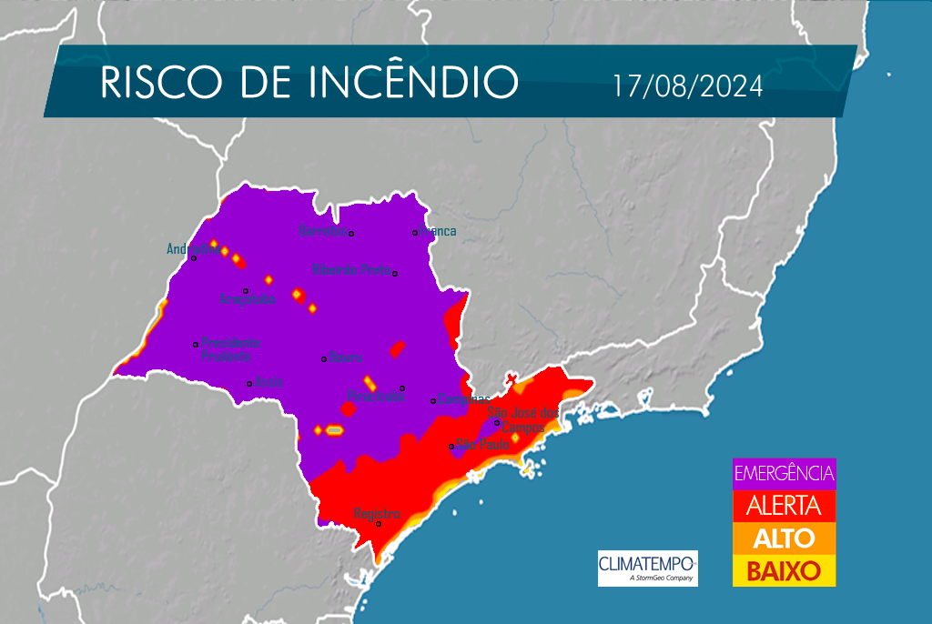 O estado de São Paulo segue com diversas regiões em estado de emergência para incêndios florestais, segundo a Defesa Civil Estadual. O Mapa de Risco de Incêndio é uma das ferramentas tecnológicas que auxiliam o órgão no monitoramento de queimadas em vegetação durante o período da estiagem.