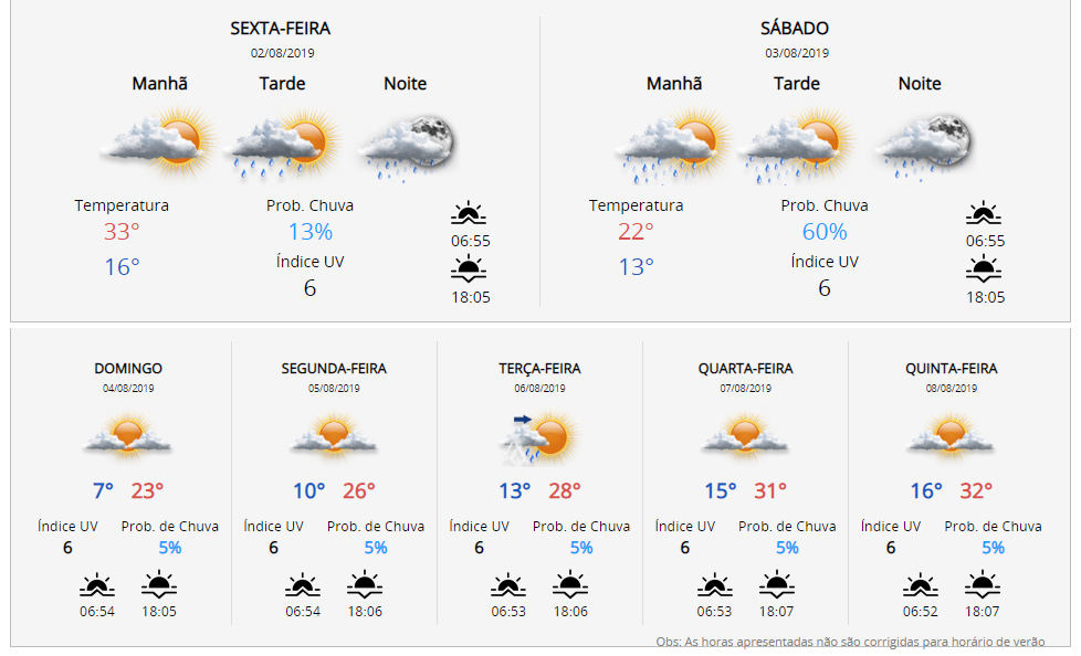 Para esta sexta-feira (2) a mínima prevista é de 16°C e máxima prevista de 33°C. Para sábado (3), a previsão é de temperatura mínima de 13°C e máxima de 22°C. Para domingo (4), a tendência é de mais queda, com precisão de temperatura mínima de 7°C e máxima de 23°C.