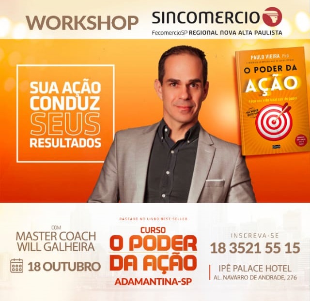 Além da palestra no dia 2 de outubro, o Sincomercio traz curso de 8h com Will Galheira no dia 18 de outubro, no Ipê Palace Hotel. Ele é palestrante oficial habilitado pelo escritor Paulo Vieira, autor do livro ‘O Poder da Ação’, o mais vendido no país no segmento business.