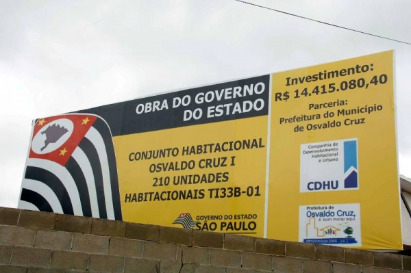 Um internauta de Osvaldo Cruz, Valdemir Anselmo, publicou em sua rede social uma denúncia em torno das obras de construção de casas populares. São 210 imóveis em construção da cidade, no valor de R$ 14.415.080,40, construídas a partir de parceria entre a Companhia de Desenvolvimento Habitacional e Urbano (CDHU) e Prefeitura.