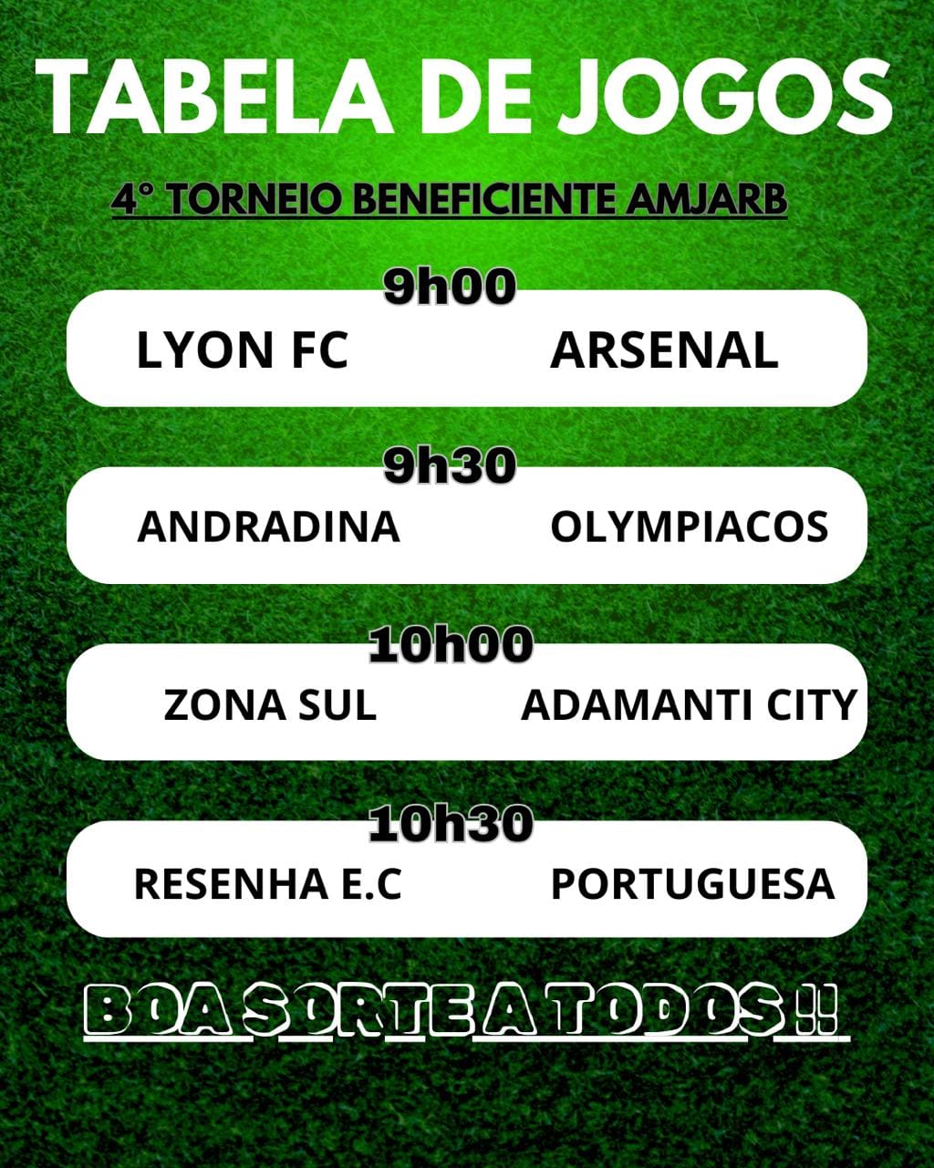 A Amjarb (Associação de Moradores do Jardim Brasil) em Adamantina promove neste domingo (5) o 4° Torneio de Futebol Beneficente. As rodadas, com oito equipes, acontecem na praça esportiva do bairro com o primeiro jogo às 9h (veja abaixo). As partidas acontecem durante toda a manhã. As premiações preveem troféus até o terceiro colocado.