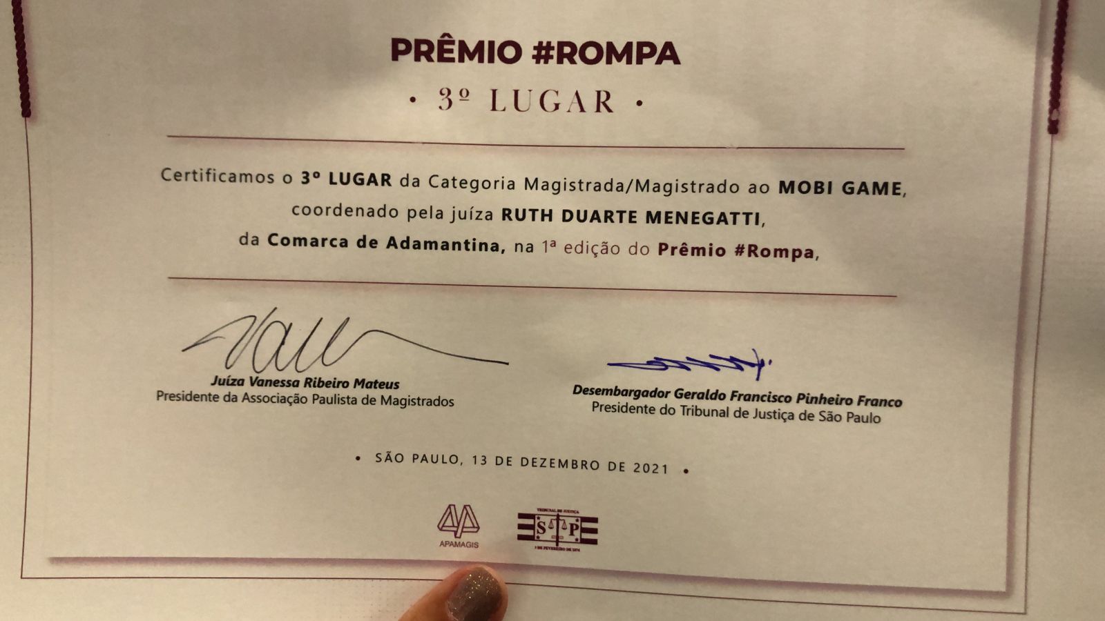 Com o “Mobi Game”, jogo de enfrentamento à violência doméstica, a juíza de direito da 3ª Vara da Comarca de Adamantina, Ruth Duarte Menegatti, recebeu na tarde desta segunda-feira (13) no Palácio da Justiça, sede do Tribunal de Justiça do Estado de São Paulo (TJSP), troféu e certificado como finalista na primeira edição do Prêmio Rompa, uma parceria do TJSP com a Associação Paulista de Magistrados (Apamagis).