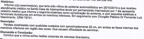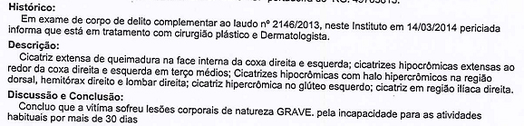 Os peritos recomendaram a realização de exame pericial complementar, após 90 dias. O novo laudo trouxe a seguinte conclusão: “Portanto, conclui-se que houve lesões corporais de natureza gravíssima na parte autora, com sérias queimaduras em diversas partes do corpo, além de cicatrizes com queloides ovaladas com aproximadamente 25 cm, em ambas as faces internas dos membros inferiores na região das coxas, gerando como consequência, sérios danos estéticos”.