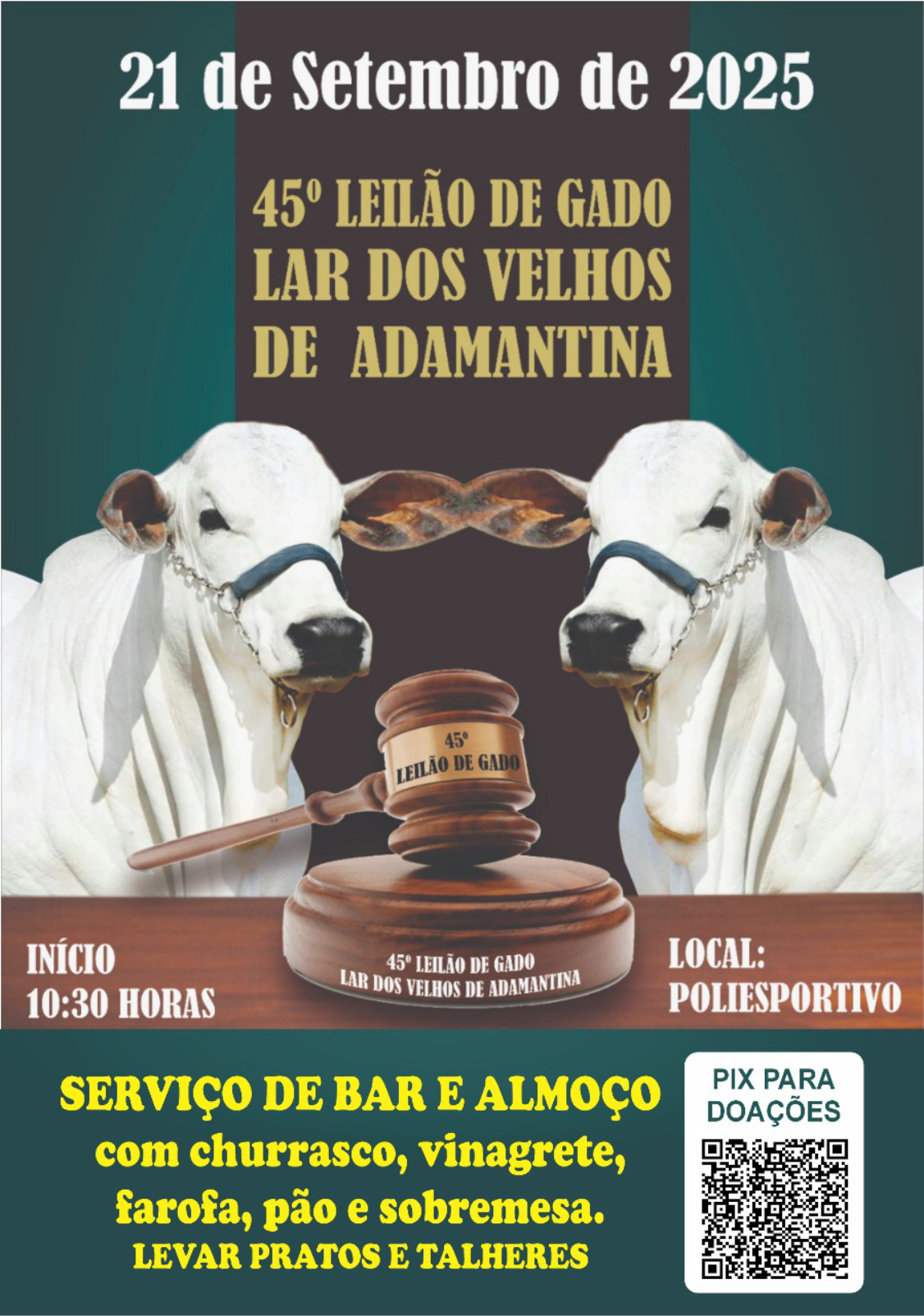O Lar dos Velhos de Adamantina realiza neste domingo (21) seu 45º Leilão de Gado e beneficente, no Recinto Poliesportivo. A programação começa às 10h30, com almoço no local, e completo serviço de bar durante todo o evento. Os convites para o almoço são vendidos a R$ 60. É preciso levar pratos e talheres.