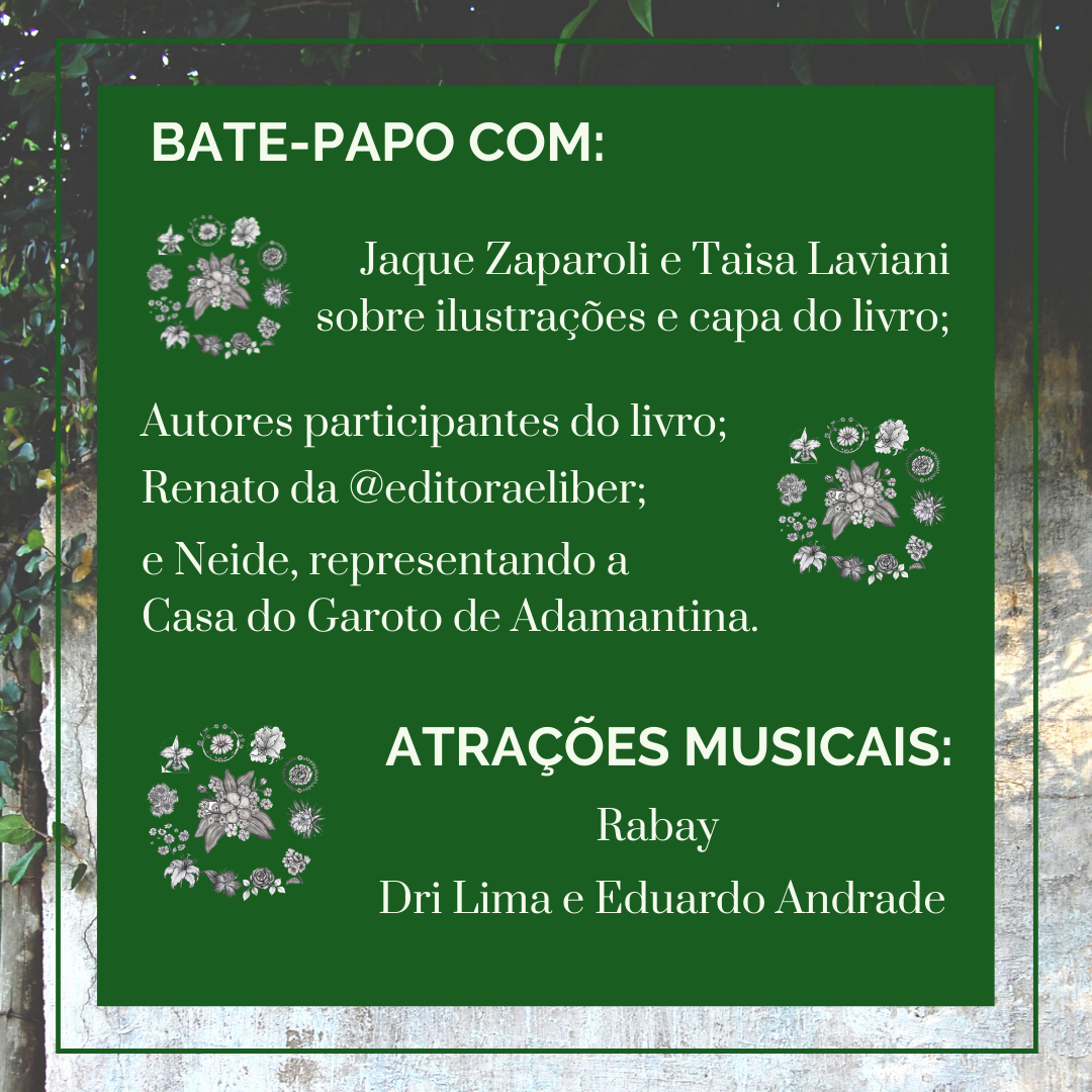 O evento contará com as participações de Rabay, com releitura musical de um dos poemas de Fernando Pessoa, e de Dri Lima Barochello e Eduardo Andrade, apresentando uma música autoral inspirada em “A Hora da Estrela”, de Clarice Lispector. Além dessas apresentações, teremos um bate-papo com a ilustradora do livro, Jaqueline Zaparolli e a fotógrafa responsável pela capa de Flor e Ser, Taisa Maria Laviani, sobre seus processos criativos para o livro. O bate-papo se estenderá aos demais autores e ao editor Renato, da editora E-liber, encarregado pela publicação do livro. Também participará da live de lançamento, Ivoni Ramos, responsável pela Casa do Garoto de Adamantina, já que parte do valor arrecadado com a venda dos livros será revertida em doações para a instituição. (Continua após a publicidade...)