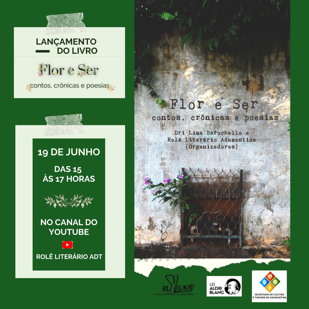 No dia 19 de junho, acontecerá o lançamento do livro Flor e Ser: contos, crônicas e poesias, organizado pelo coletivo Rolê Literário de Adamantina e por uma de suas fundadoras, Dri Lima Barochello. Flor e Ser, além de livro é um encontro de gerações que carregam em si o amor pela literatura: onze jovens autores, com seus contos, crônicas e poesias, leem e comentam onze escritos de Geni Omin, a matriarca de nosso jardim. O lançamento será transmitido ao vivo pelo canal do Rolê Literário de Adamantina no Youtube, a partir das 15 horas com previsão de término para as 17h.