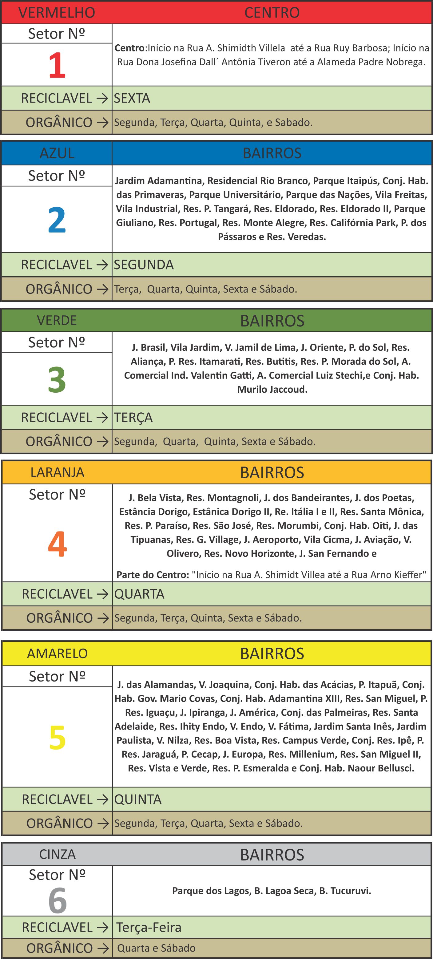 Na área central de Adamantina, segundo informa o site da Prefeitura local, a coleta de lixo orgânico ocorre de segunda a quinta, e aos sábados. Às sextas-feiras é realizada a coleta de lixo reciclável. Veja aqui os setores de toda a cidade e o calendário das coletas de lixo orgânico e reciclável.