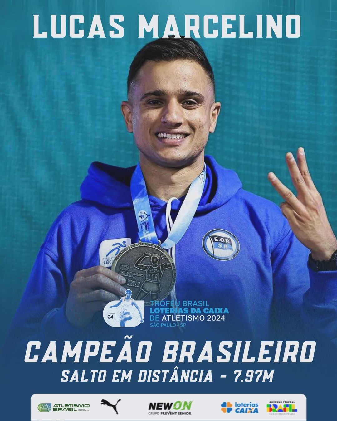 Lucas Marcelino, de Adamantina, atleta do Esporte Clube Pinheiros (São Paulo/SP) conquistou medalha de ouro com 7.97 m no salto em distância, nesta sexta-feira (28), no Troféu Brasil de Atletismo, que começou na quinta-feira (27) e segue até domingo (30) em São Paulo.