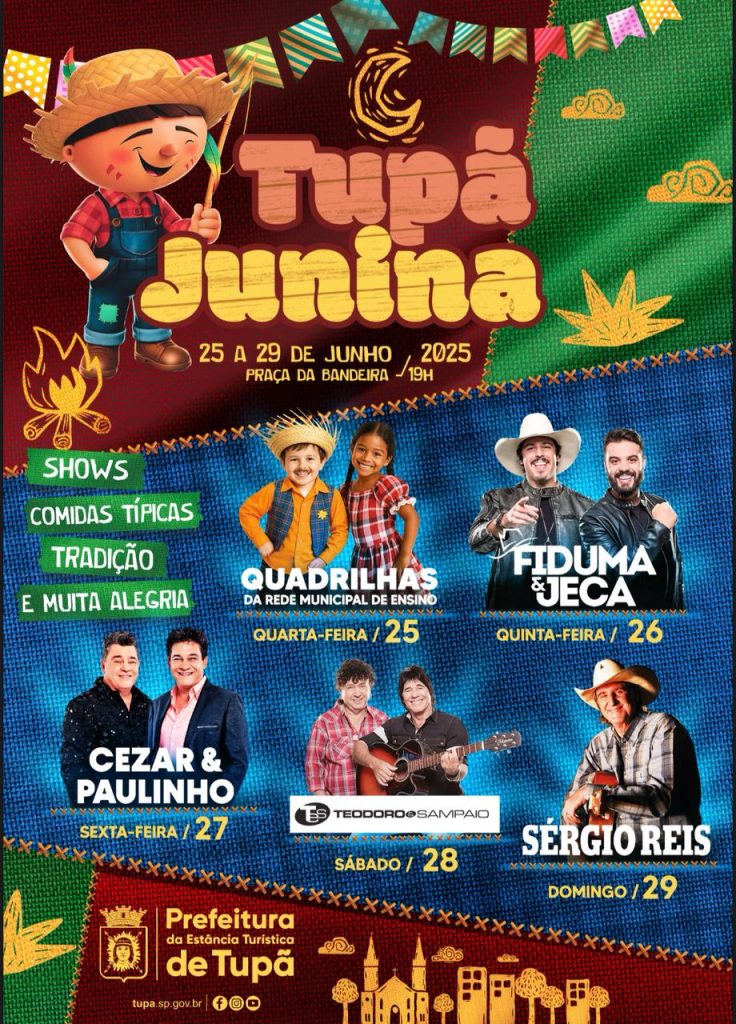 Tupã também divulgou uma programação especial pelo Dia do Padroeiro, São Pedro Apóstolo, celebrado em 29 de junho. A cidade anunciou o “Tupã Junina”, um dos principais eventos da cidade, que neste ano acontece de 25 a 29 de junho, na Praça da Bandeira.