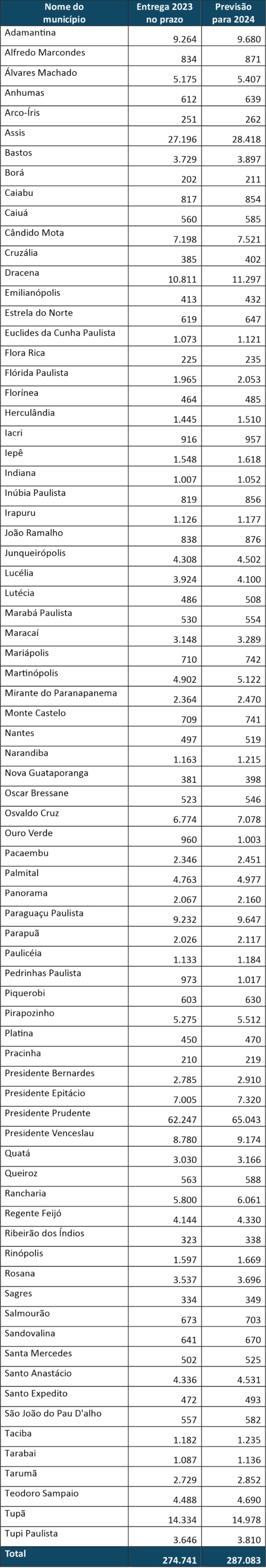 Dos mais de 287 declarações esperadas o maior montante é da cidade de Presidente Prudente: 65.043. Em seguida aparece Assis, com a expectativa de 28.418 declarações. Depois Tupã, com previsão de 14.978. A menor participação é de Borá, com previsão de 211 declarações. Pracinha fica em penúltimo, com 219.
