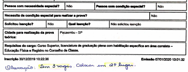 Outra evidência da fraude: anotação manual informa vagas e define classificação do candidato (Reprodução).