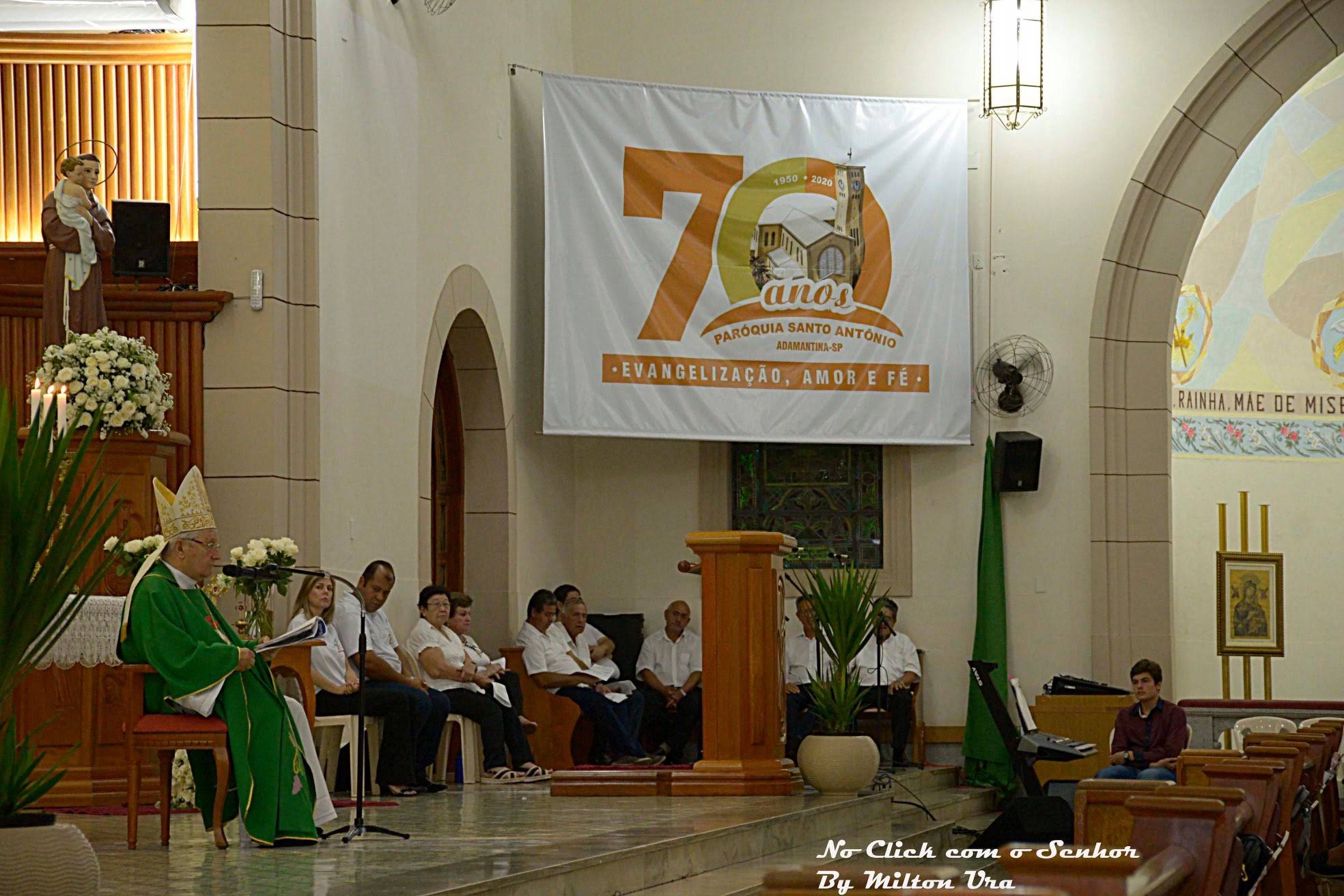 Uma missa em ação de graças presidida pelo bispo emérito da Diocese de Marília, Dom Osvaldo Giuntini, marcou a abertura oficial da programação dos 70 anos da Paróquia de Santo Antônio, de Adamantina. A celebração festiva foi realizada na noite deste sábado (25), data em que a Paróquia foi criada por ato do então bispo de Cafelândia, dom Henrique Gelain (que dá nome à praça onde está instalada a Igreja Matriz), quando a desmembrou da Paróquia de Lucélia.