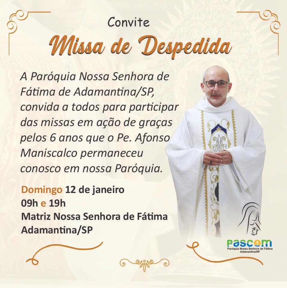 Conforme a dinâmica de revezamento dos padres, realizada pela Diocese de Marília, padre Afonso deixa Adamantina e vai assumir a Paróquia São José Operário, em Tupã, onde será empossado no dia 2 de fevereiro.