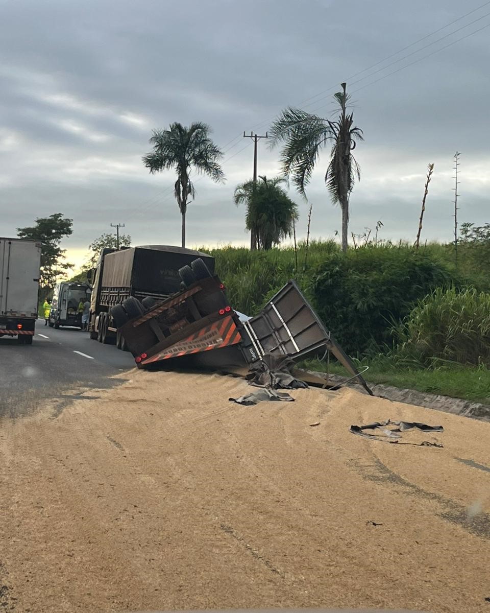 Condutor do caminhão não se feriu. Carga de soja em grãos esparramou na pista.