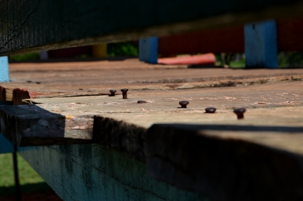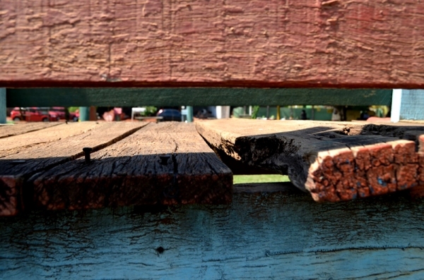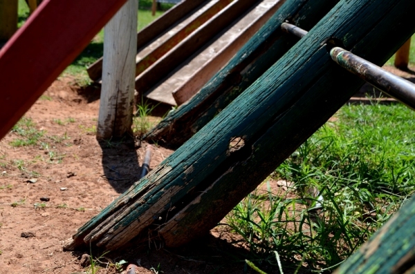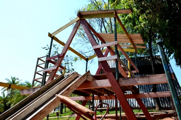 No Parque dos Pioneiros o playground tem madeiras soltas na plataforma que conecta as duas “casinhas”, além de pregos com as cabeças expostas, o que pode causar ferimentos nos pés das crianças. Há parte da estrutura de fechamento amarrada presa com arame e sinais de apodrecimento da madeira, em alguns pontos, junto ao solo.