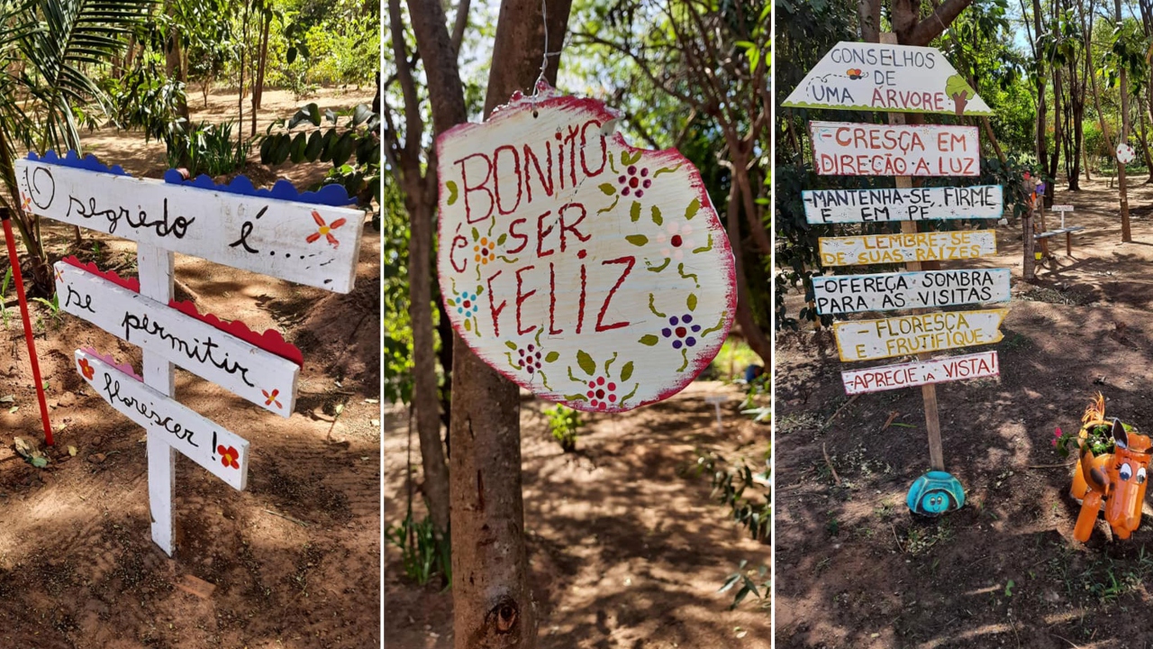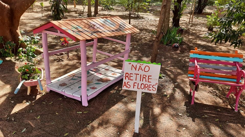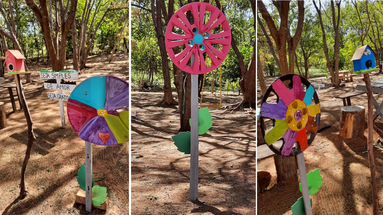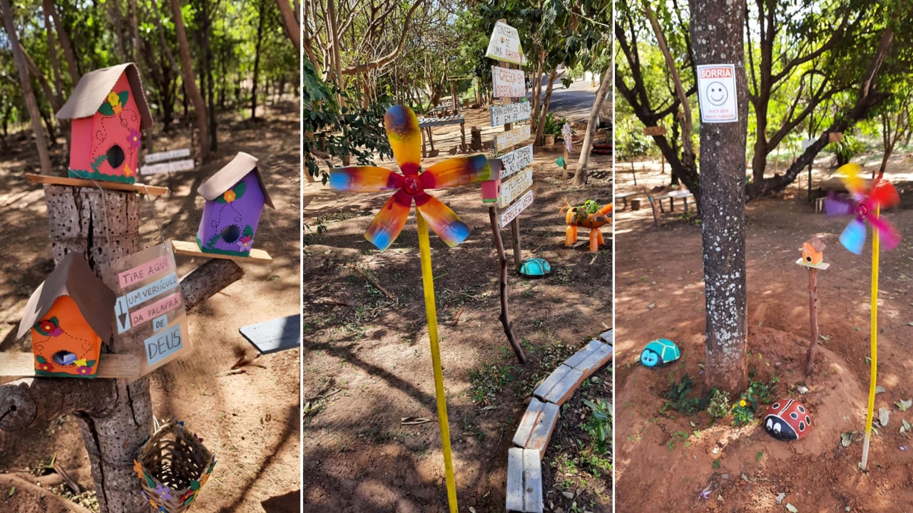 Também foram instaladas casas de passarinhos em galhos secos, e ainda há placas com mensagens positivas espalhadas por todo o lugar, além de informes de orientação para que todos cuidem do espaço coletivo. Todos os trabalhos manuais são carregados com cores vivas e vibrantes.