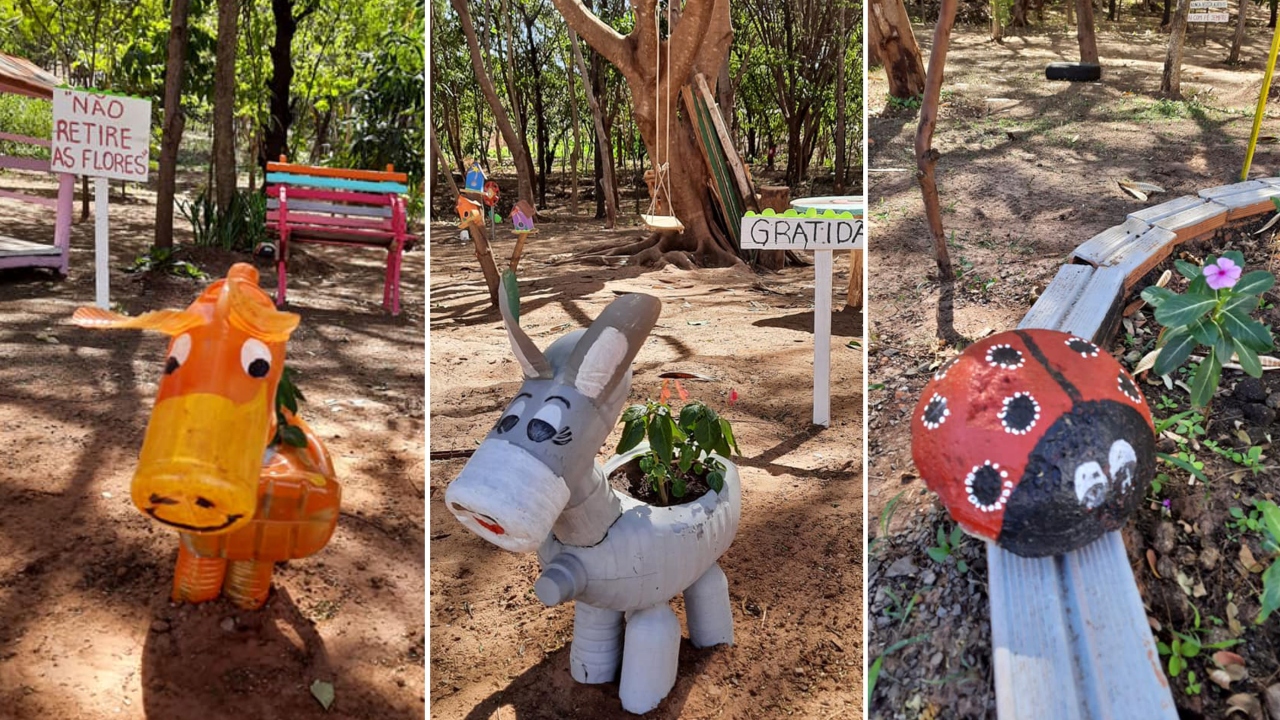 As garrafas pet, provenientes de embalagens de refrigerantes, sucos e produtos de limpeza ganharam formas de animais e se tornaram floreiras. Outras peças, também com contornos de animais, decoram o espaço. As calotas de rodas de veículos foram transformadas em flores.