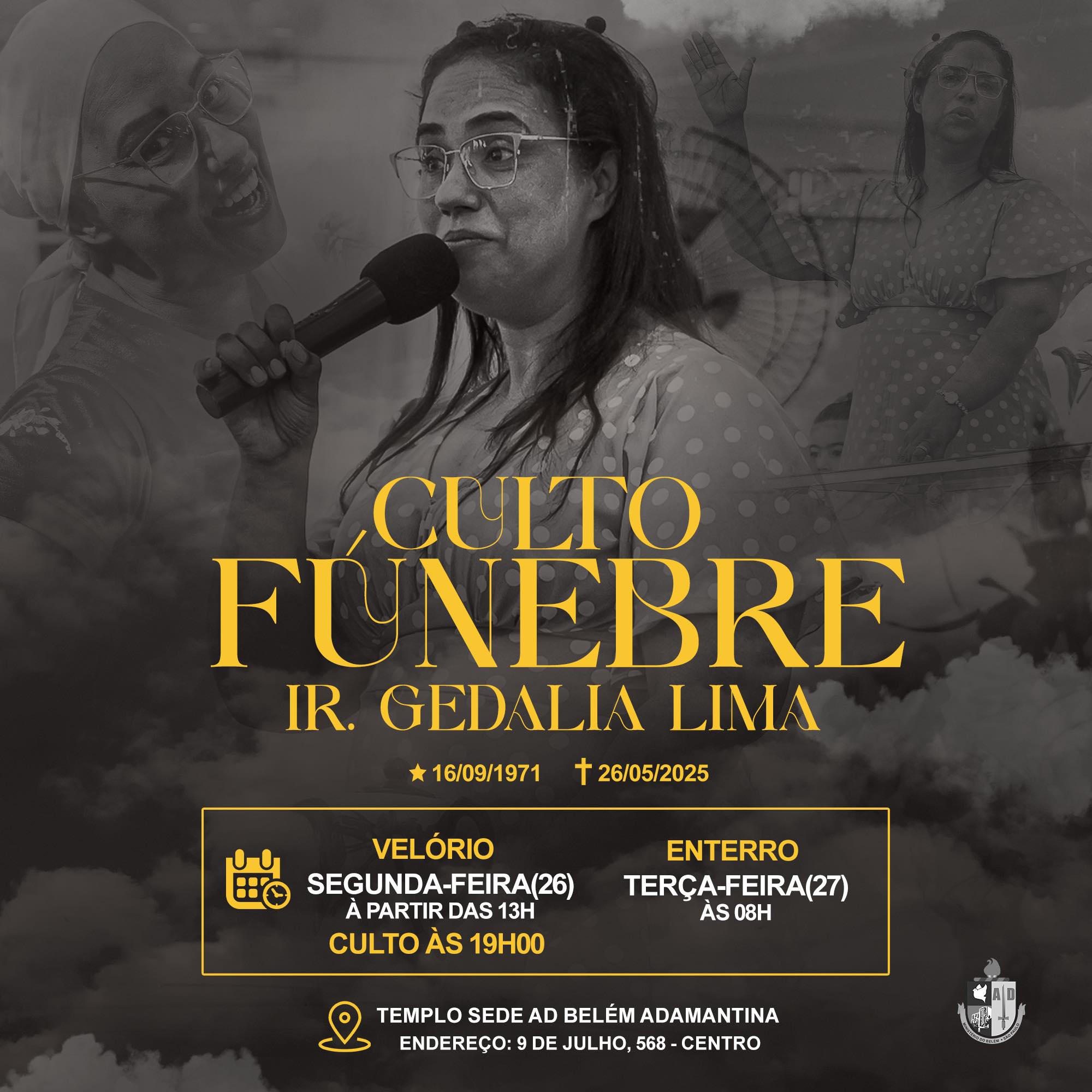 Morreu nesta segunda-feira (26) aos 53 anos Gedalia Alves da Silva Lima, maestrina, professora e regente geral da Ufadca (União Feminina das Assembleias de Deus no campo de Adamantina). O comunicado oficial foi feito em uma publicação no final da madrugada de hoje nas redes sociais da Igreja Evangélica Assembleia de Deus – Ministério do Belém, Campo de Adamantina.