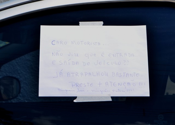 No bilhete, o seguinte desabafo: “Caro motorista... não viu que é entrada e saída de veículos?? Já atrapalhou bastante. Preste + atenção!!! Ninguém sai e ninguém entra!!!!” (sic).