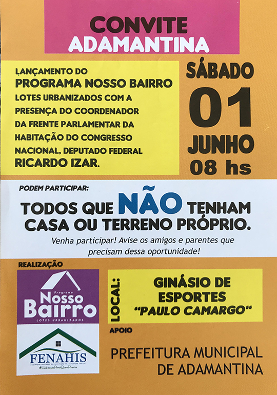 No mesmo vídeo, está o deputado federal Ricaro Izar, que se identificou como presidente da frente parlamentar de habitação no Congresso Nacional. “Estamos trazendo para Adamantina um novo programa, o Nosso Bairro, programa de lotes urbanizados”, afirmou em sua declaração. Ainda o vídeo estão o presidente da entidade, Marcelo Roberto Augusto, e a vereadora Dinha Gil (DEM).