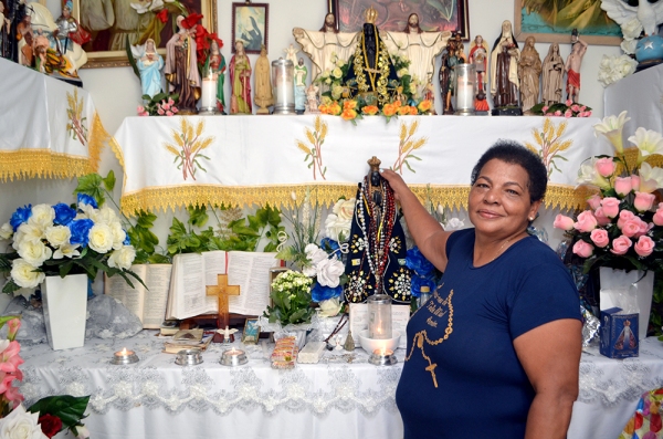Vera Lúcia de Assunção é devota fervorosa de Nossa Senhora Aparecida e tem um cômodo em sua casa dedicado a orações. O espaço é um refúgio particular e íntimo, onde realiza suas orações, com agradecimentos e pedidos a si e aos outros, sempre com a disposição de oferecer um apoio aos que mais precisam.